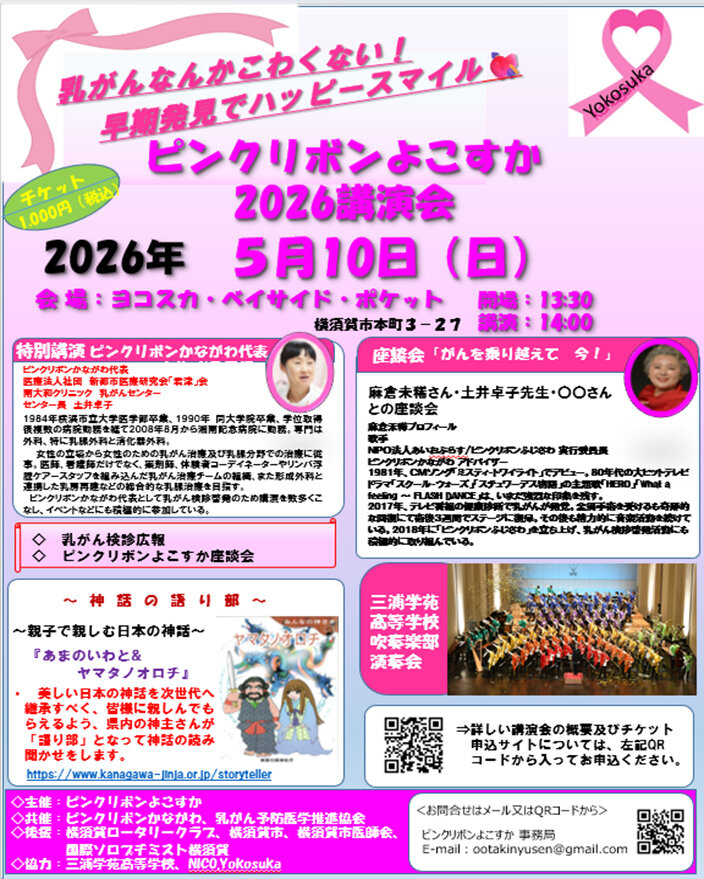 横須賀ロータリークラブでは、乳がんの早期発見・早期治療の大切さを知ってもらい受診率を向上させ、一人でも多くの大切な命を守る活動を昨年度に引続き「ピンクリボンよこすかチャリティー講演会」をヨコスカ・ベイサイド・ポケットにおいて開催いたします。